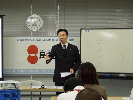 民主党京都府連主催の「政治スクール」に講師として依頼を受け、お話ししました。東日本大震災以降の官邸でのオペレーションから、被災地各地での復旧・復興への取り組みについて講演させていただきました。