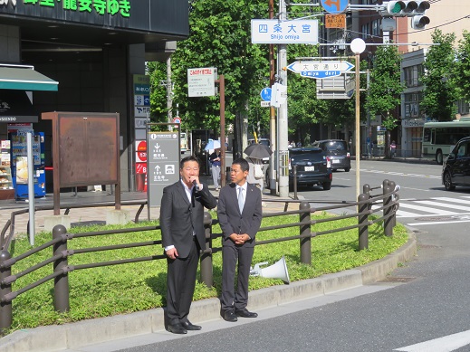 四条大宮の交差点をお借りして、朝の街頭演説をさせていただきました。地元中京区選出の田中けんじ府議とご一緒です。この場所は20年以上、街宣に立たせていただいています。今朝も多くの激励や声援をいただきました。ありがとうございました。
